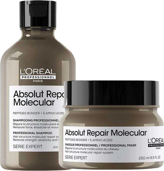 L’Oréal Professionnel Absolut Repair Molecular Shampoo + Mask Voordeelset is speciaal ontwikkeld om de moleculaire structuur van beschadigd haar te herstellen. Deze verzorgingsroutine omvat een herstellende shampoo 300 ml en een intensief voedend masker 250 ml, waardoor je haar sterker en beter gevoed aanvoelt, met meer veerkracht en natuurlijke soepelheid. Het masker maakt je haar bovendien gemakkelijker doorkambaar en zijdezacht. Herstel tot 2 jaar aan haarbeschadiging in slechts één toepassing.*