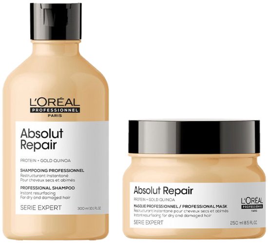 L’Oréal Professionnel Serie Expert Absolut Repair shampoo en haarmasker zijn speciaal ontwikkeld voor droog en beschadigd haar dat intensief herstel nodig heeft. Deze professionele verzorgingslijn helpt de haarvezel van binnenuit te versterken en geeft het haar opnieuw kracht, zachtheid en een gezonde uitstraling.